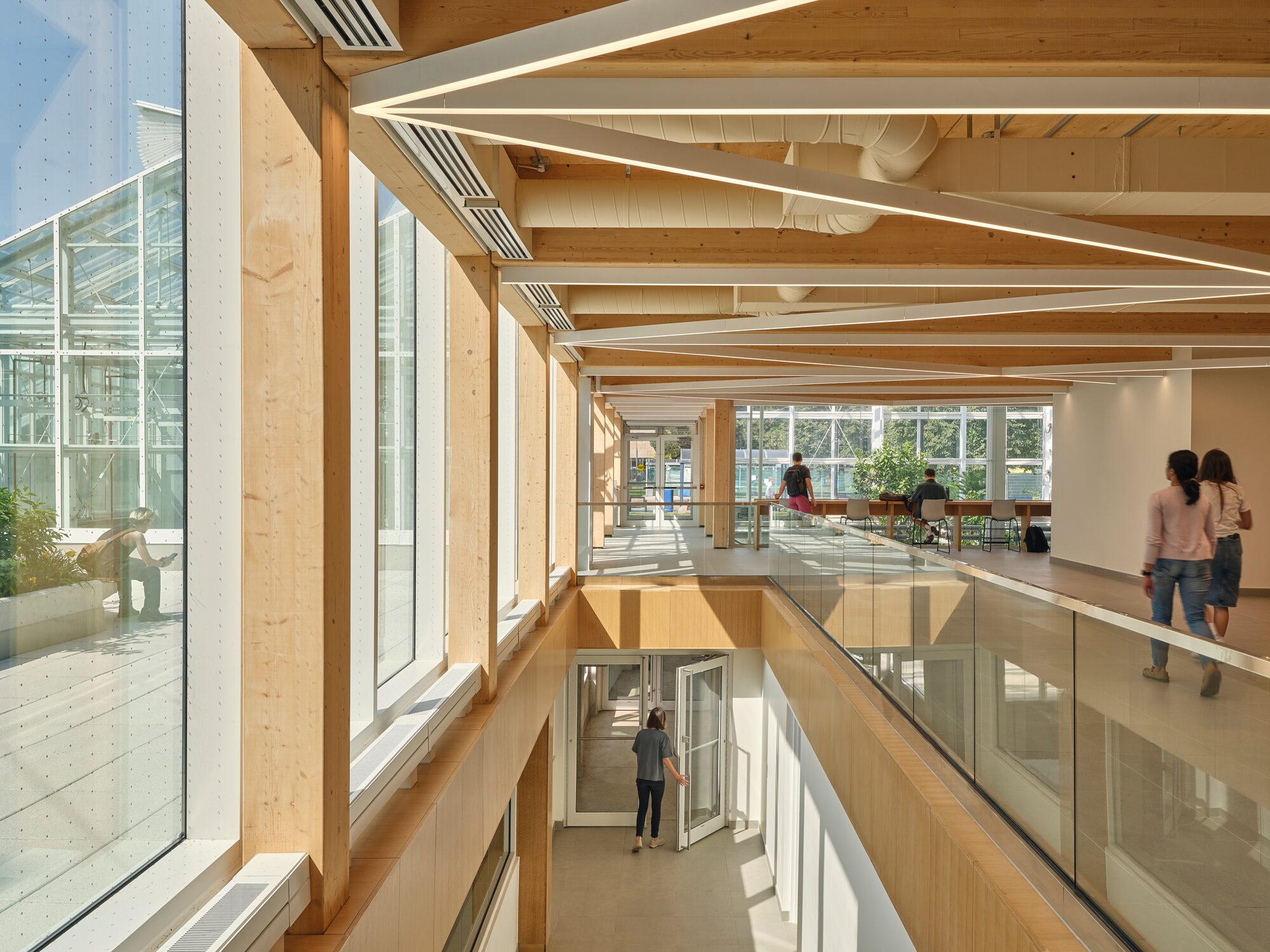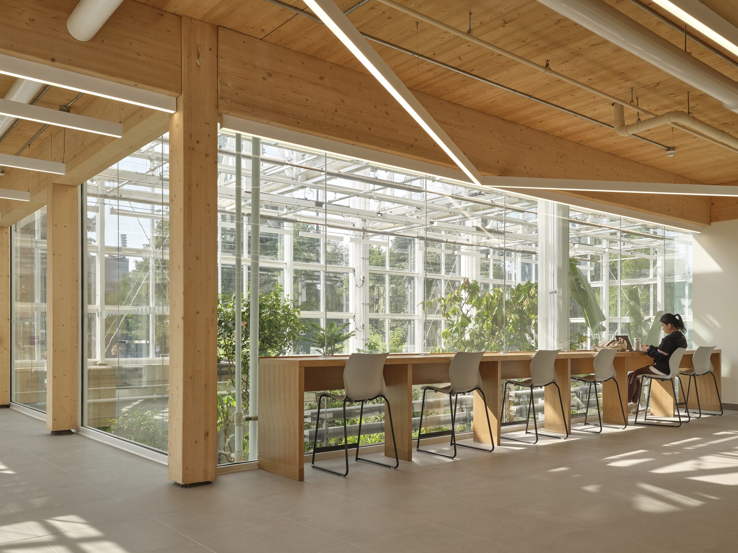 Our Toronto team collaborated with consultants and construction partners to completely reimagine the five-storey facility. We renovated existing classrooms, study areas, barrier-free bathrooms, and a mass-timber lobby fitted with new lighting, while also adding an 11,400 sq. ft. below-grade greenhouse that will serve the Department of Biology’s faculty, staff, and students.