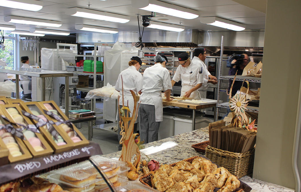 Today, food prepared by the Culinary students is sold to professionals in the building and mall-goers, and is a very popular and busy place. Custom classes are also offered to the public in this space.