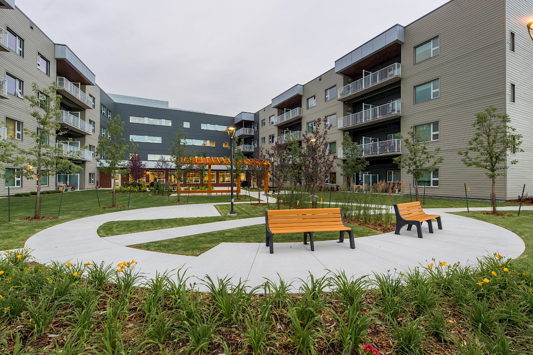 This seniors living facility was completed using integrated project delivery (IPD). It included 158 units with balconies; a parking garage; two courtyards; a communal greenhouse; amenities such as a salon, an exercise facility, a theatre room, a commercial kitchen, a dining area, and a multi-faith room.